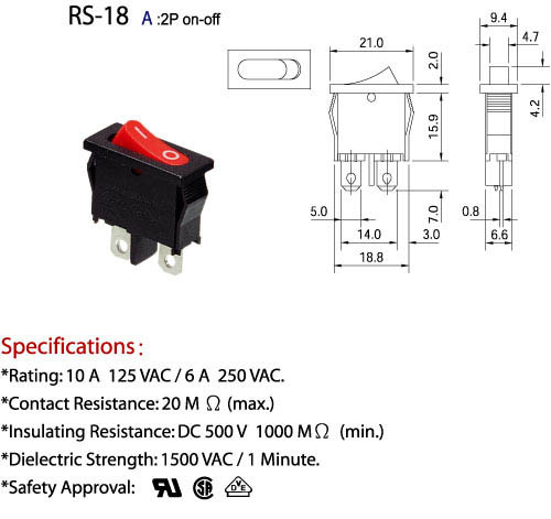 電氣範圍: 10 A 125 VAC/ 6A 250 VAC.
