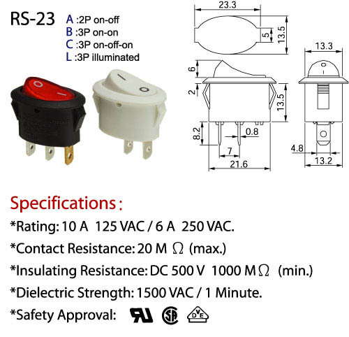* 電氣範圍: 10 A 125 VAC/ 6A 250 VAC.