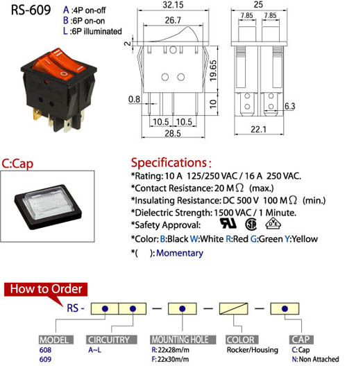 * 電氣範圍: 10 A 125 VAC/ 6A 250 VAC.