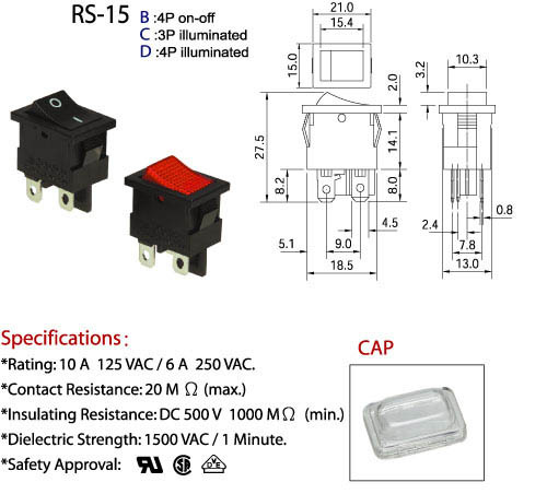 電氣範圍: 10 A 125 VAC/ 6A 250 VAC.