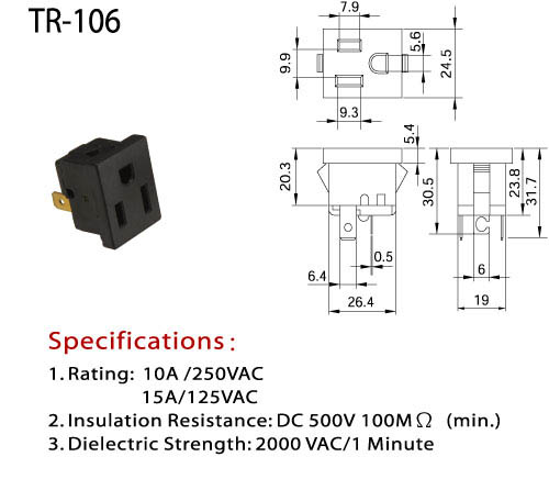 * 電氣範圍 : 10A 250 VAC/ 15A 250 VAC.