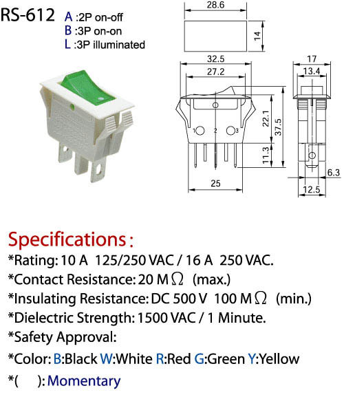 電氣範圍: 10 A 125 VAC/ 6A 250 VAC.